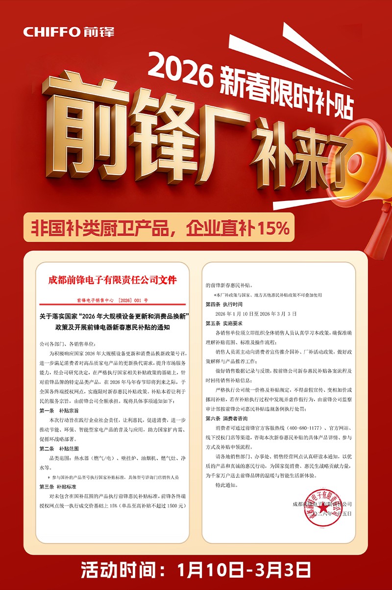 新年煥新,溫暖升級,2026年國補(bǔ)政策榮耀回歸!前鋒再次入選國家指定補(bǔ)貼單位,為您的品質(zhì)生活助力!更重磅的是,前鋒推出“新春廠補(bǔ)”,誠意拉滿,補(bǔ)貼不打折、不套路,雙線補(bǔ)貼,15%直降,讓您一次購齊,暖意全開!
