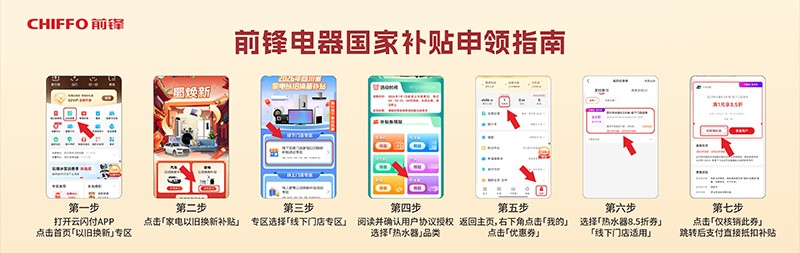 前鋒作為您身邊“國家認(rèn)證”的補(bǔ)貼放心站,購買一級能效熱水器,可享15%國家直補(bǔ),流程超簡單: